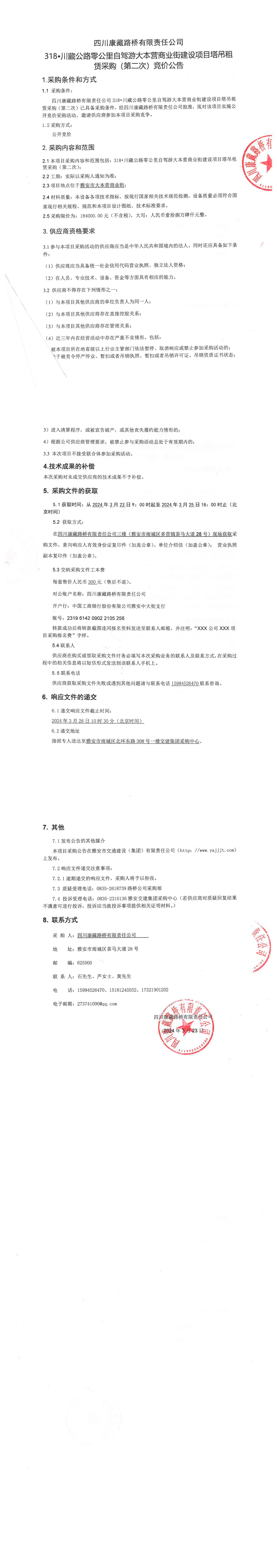 四川康藏路橋有限責(zé)任公司318•川藏公路零公里自駕游大本營(yíng)商業(yè)街建設(shè)項(xiàng)目塔吊租賃采購(gòu)(第二次)競(jìng)價(jià)公告
