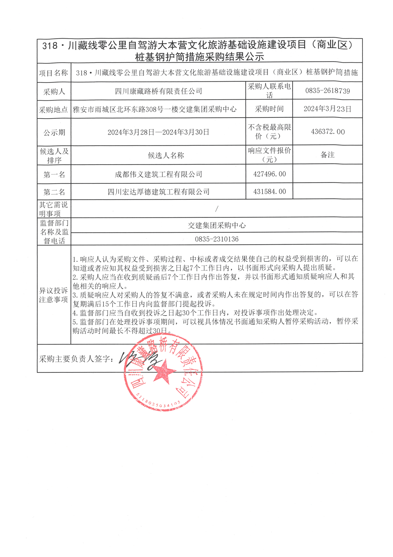 四川康藏路橋有限責任公司318·川藏公路零公里自駕游大本營文化旅游基礎設施建設項目(商業(yè)區(qū))樁基鋼護筒措施采購結果公示