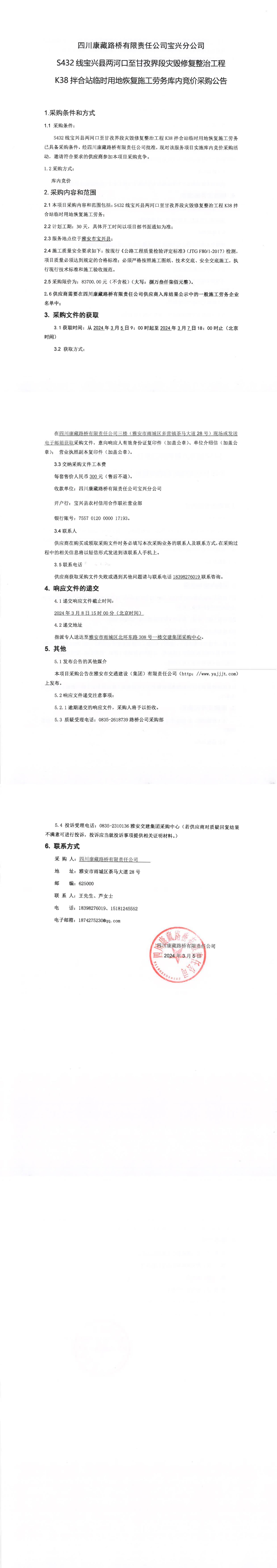 四川康藏路橋有限責(zé)任公司S432線(xiàn)寶興縣兩河口至甘孜界段災(zāi)毀修復(fù)整治工程K38拌合站臨時(shí)用地恢復(fù)施工勞務(wù)庫(kù)內(nèi)競(jìng)價(jià)采購(gòu)公告