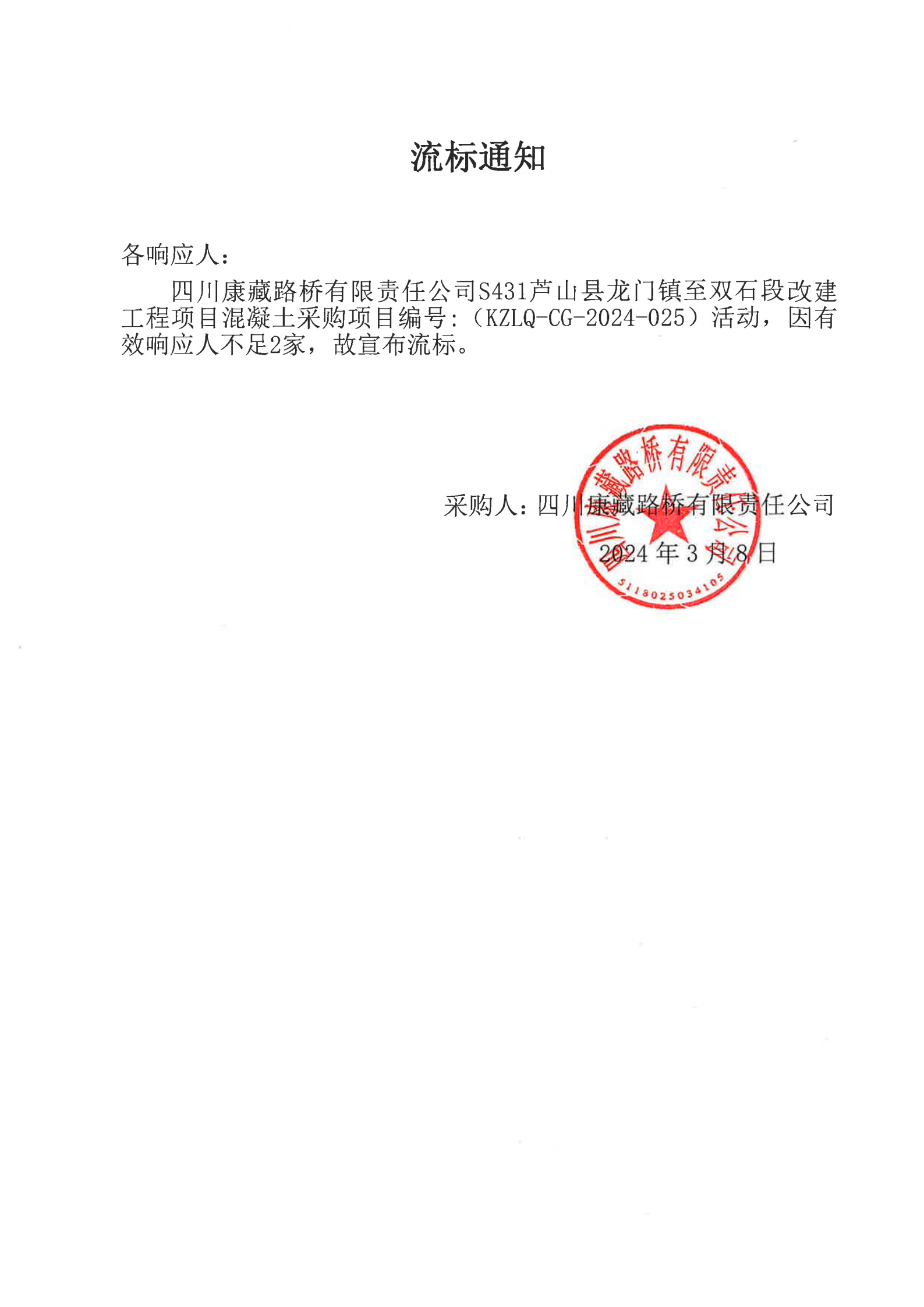 四川康藏路橋有限責(zé)任公司S431蘆山縣龍門鎮(zhèn)至雙石段改建工程項(xiàng)目混凝土采購流標(biāo)通知