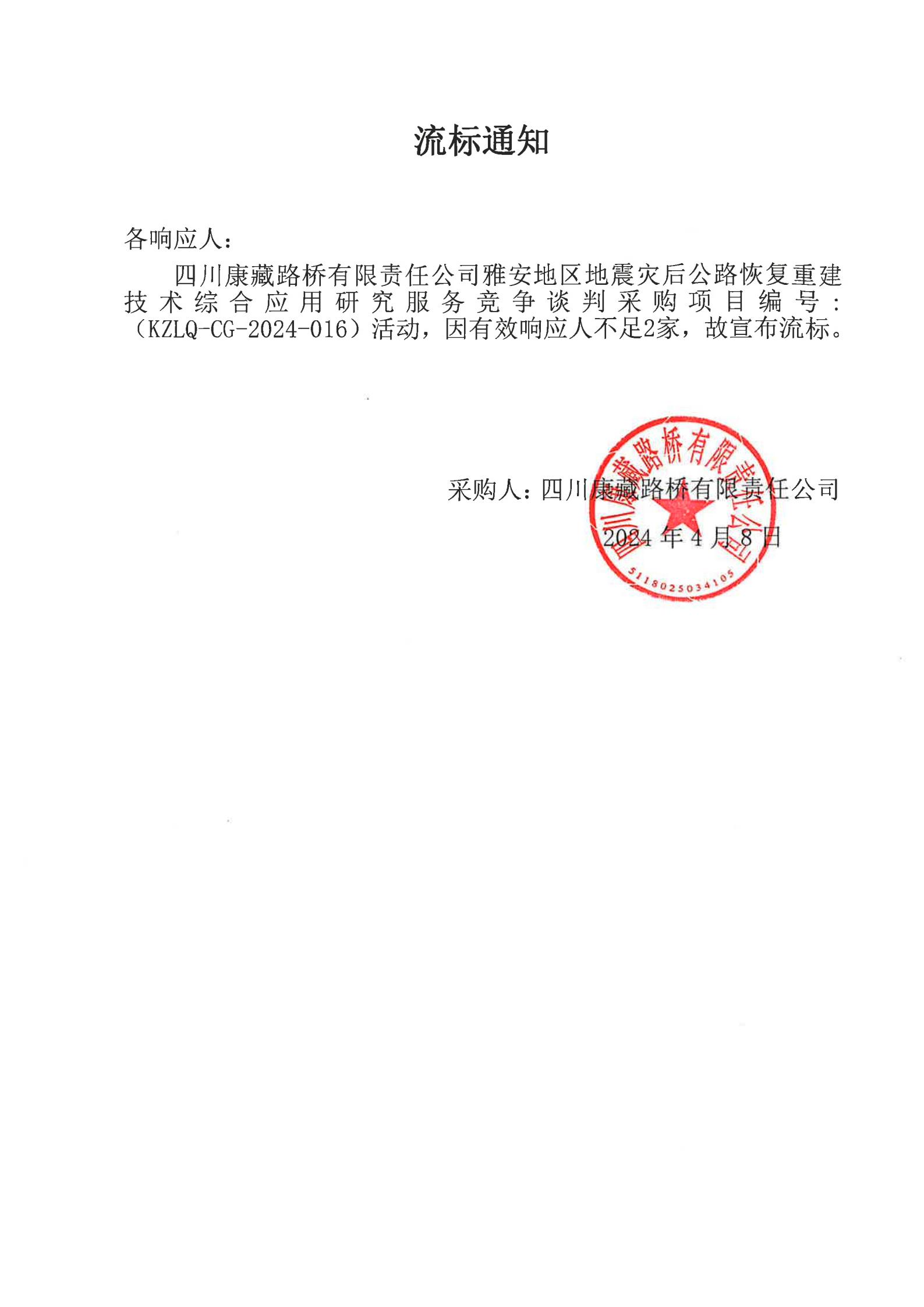 四川康藏路橋有限責任公司雅安地區(qū)地震災后公路恢復重建技術綜合應用研究服務流標通知