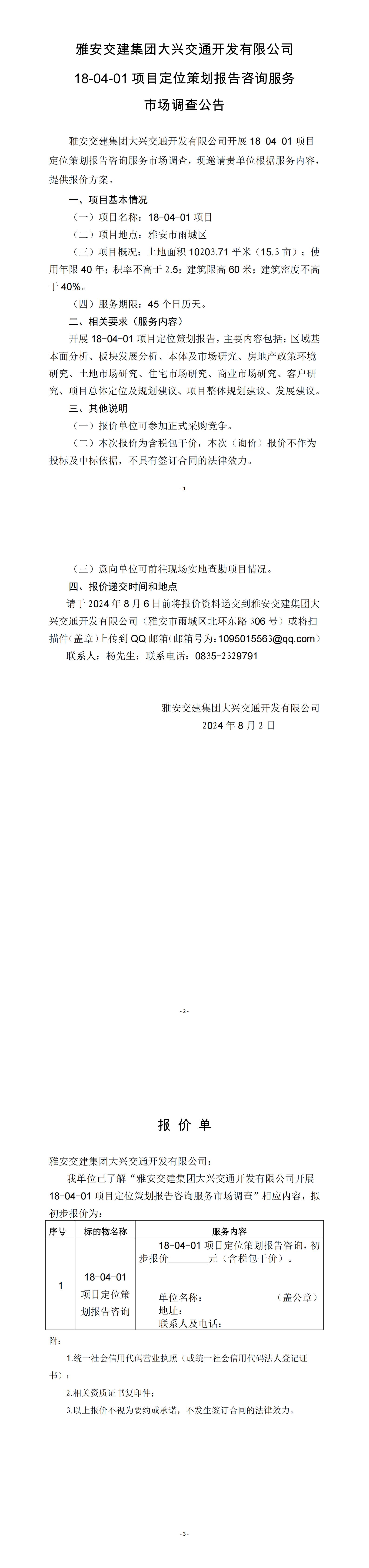 雅安交建集團(tuán)大興交通開發(fā)有限公司18-04-01項(xiàng)目定位策劃報(bào)告咨詢服務(wù)市場調(diào)查公告