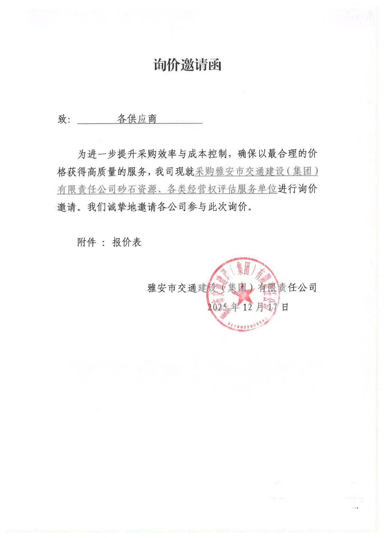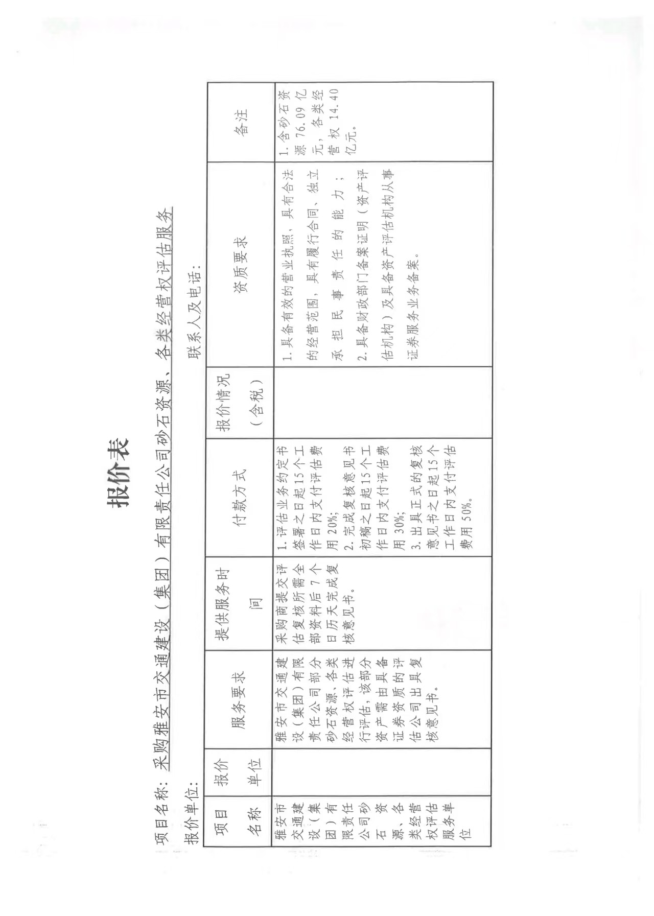 關(guān)于雅安市交通建設(shè)(集團)有限責(zé)任公司砂石資源、各類經(jīng)營權(quán)評估服務(wù)限價的詢價函