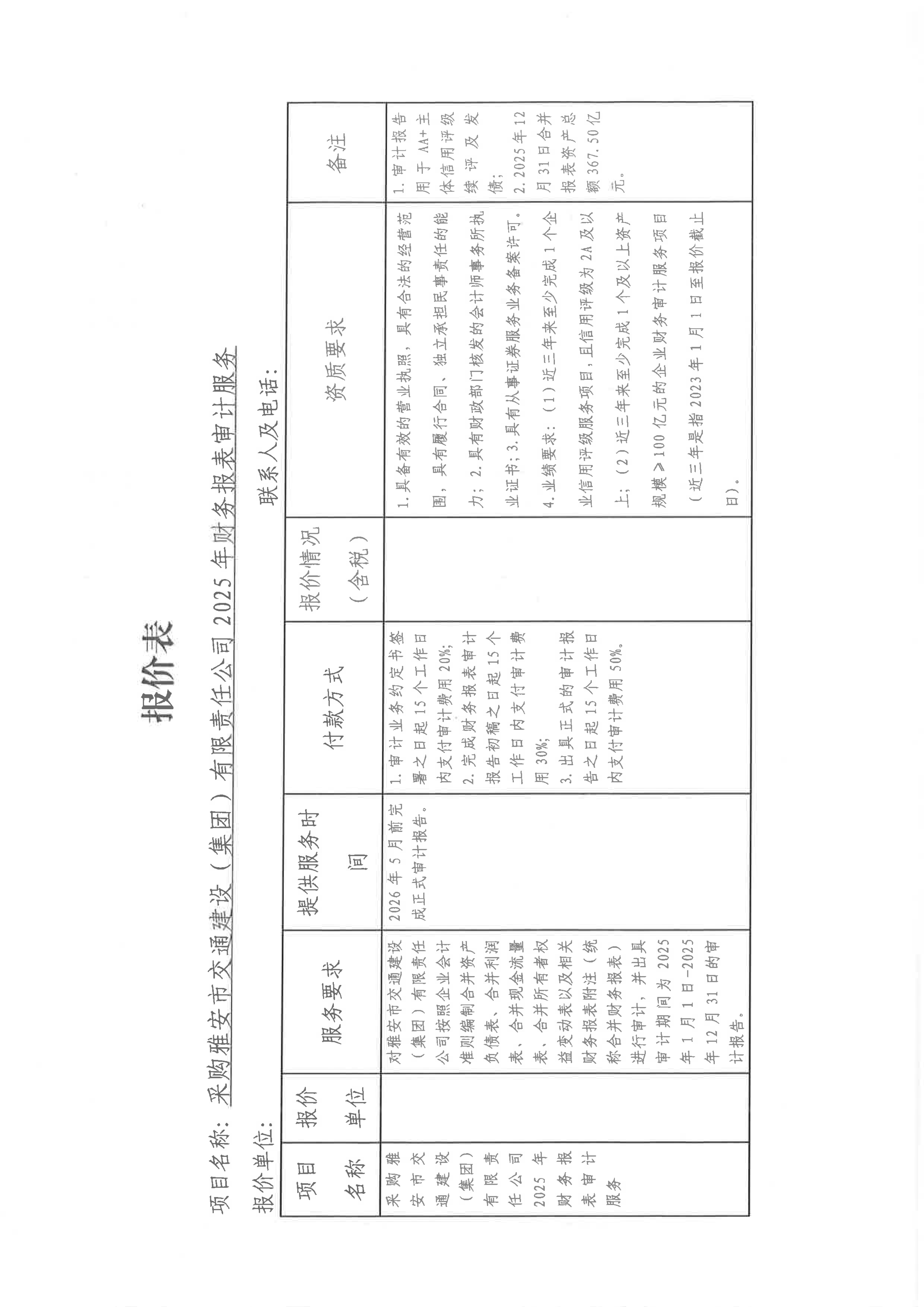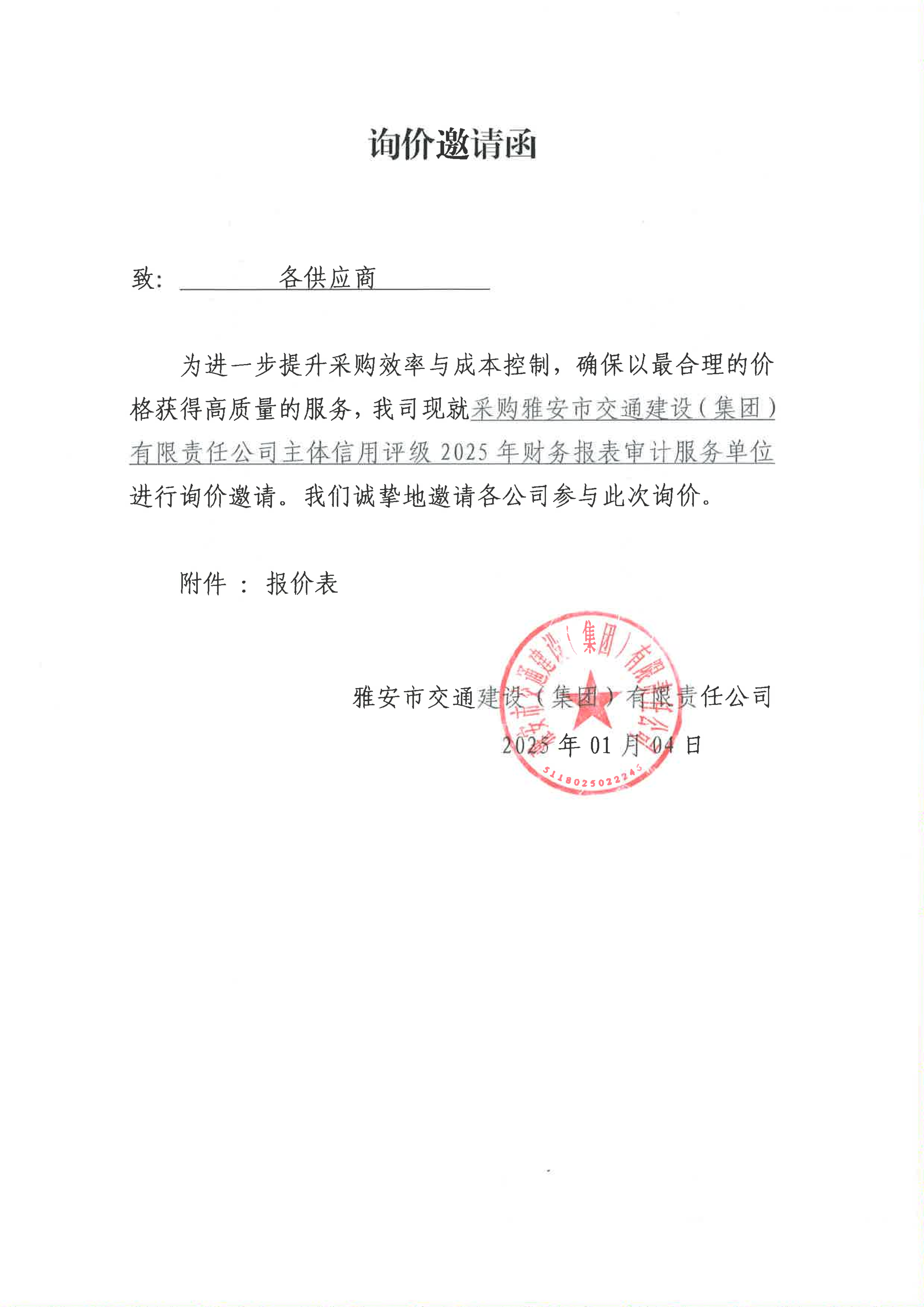 關于采購雅安市交通建設(集團)有限責任公司主體信用評級2025年財務報表審計服務限價的詢價函