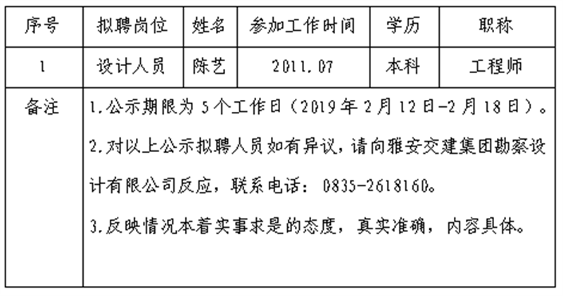 通過公開報名、資格審查、面試等程序,經(jīng)雅安交建集團(tuán)勘察設(shè)計有限公司研究,對以下1名擬聘用人員予以公示: