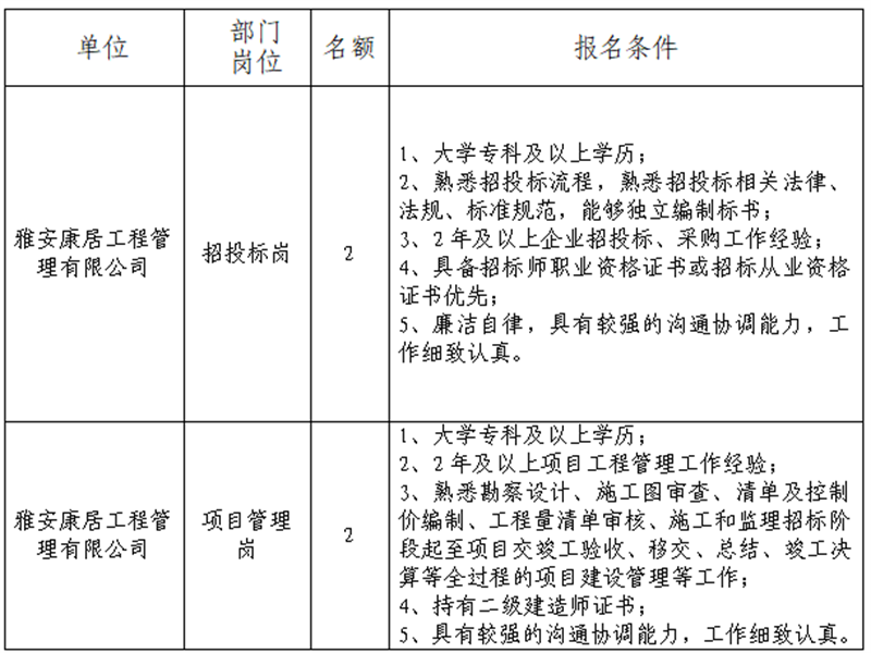 根據(jù)發(fā)展需要,決定面向社會公開招聘雅安市交通建設(shè)(集團(tuán))有限責(zé)任公司(以下簡稱“雅安交建集團(tuán)”)所屬子公司工作人員4名,現(xiàn)將有關(guān)事項(xiàng)公告如下: