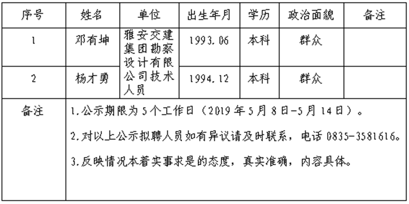 雅安交建集團子公司擬聘用人員公示(勘察設計公司)