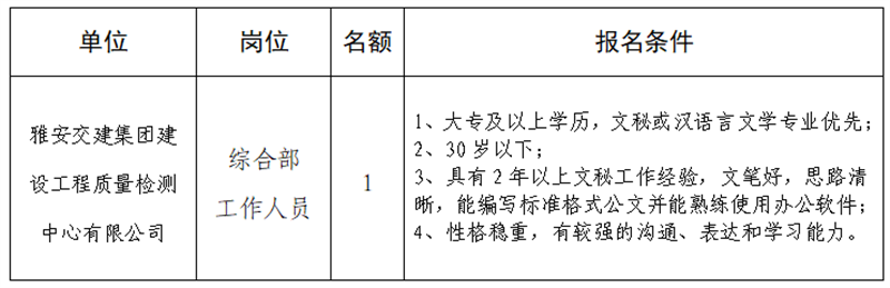 根據(jù)發(fā)展需要,決定面向社會公開招聘雅安市交通建設(shè)(集團(tuán))有限責(zé)任公司(以下簡稱“雅安交建集團(tuán)”)所屬子公司工作人員1名,現(xiàn)將有關(guān)事項(xiàng)公告如下:
