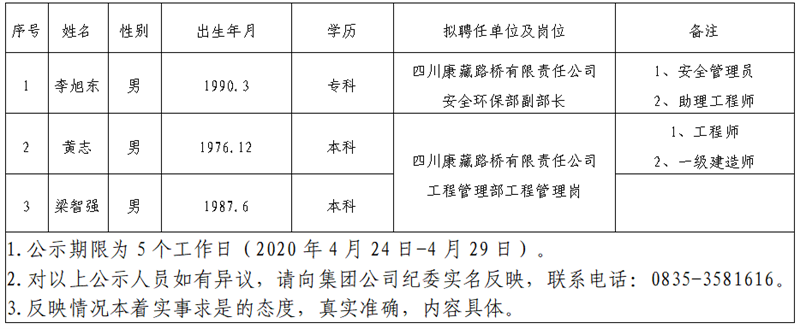 根據(jù)雅安市交通建設(集團)有限責任公司招聘公告,經(jīng)公開報名、資格初審、筆試、面試、體檢考察等環(huán)節(jié),現(xiàn)將以下3名擬聘用人員予以公示: