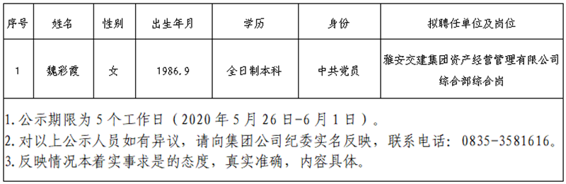 根據(jù)雅安市交通建設(集團)有限責任公司招聘公告,經(jīng)公開報名、資格初審、筆試、面試、體檢考察等環(huán)節(jié),現(xiàn)將以下1名擬聘用人員予以公示: