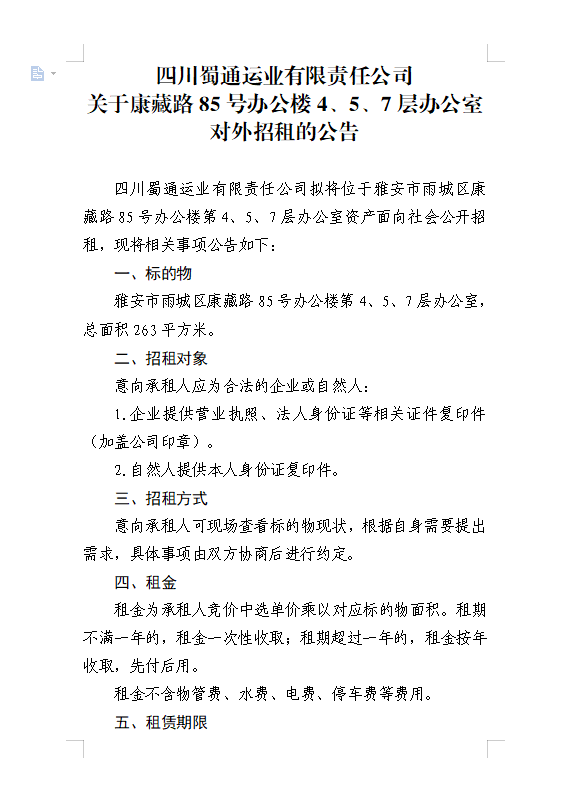 四川蜀通運(yùn)業(yè)有限責(zé)任公司關(guān)于康藏路85號(hào)辦公樓4、5、7樓資產(chǎn)租賃公告附件
