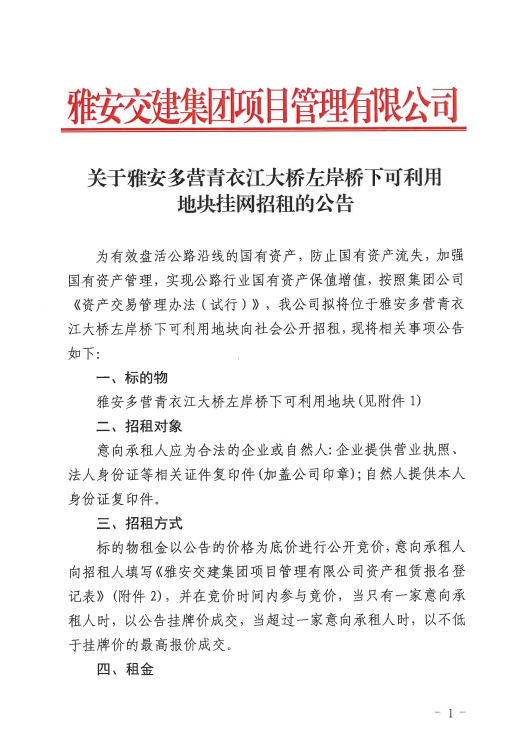 雅安交建集團(tuán)項(xiàng)目管理有限公司關(guān)于雅安多營青衣江大橋左岸橋下可利用地塊掛網(wǎng)招租的公告附件