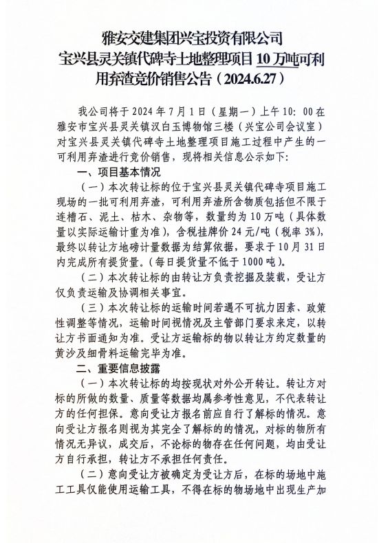 雅安交建集團(tuán)興寶投資有限公司寶興縣靈關(guān)鎮(zhèn)代碑寺土地整理項目10萬噸可利用棄渣競價銷售公告(2024.6.27)