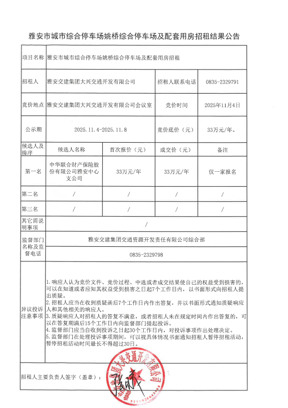 雅安市城市綜合停車場姚橋綜合停車場及配套用房招租結果公告