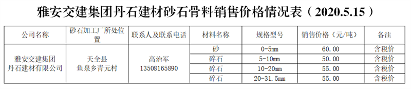 丹石建材有限公司。丹石公司是天全縣人民政府指定天全縣二郎山文化旅游投資開發(fā)有限公司與雅安市交通建設(shè)(集團(tuán))有限責(zé)任公司共同組建的合資公司。公司通過公開競拍取得儲(chǔ)量2000萬方的魚泉獅子山灰?guī)r礦,并在天全縣魚泉鄉(xiāng)青元村建立砂石骨料生產(chǎn)線,設(shè)計(jì)年產(chǎn)能200萬噸。目前,礦山開采項(xiàng)目處于在建階段,砂石生產(chǎn)加工廠區(qū)處于設(shè)備調(diào)試和產(chǎn)能驗(yàn)收階段。生產(chǎn)廠區(qū)距雨城區(qū)中心城區(qū)約50公里。