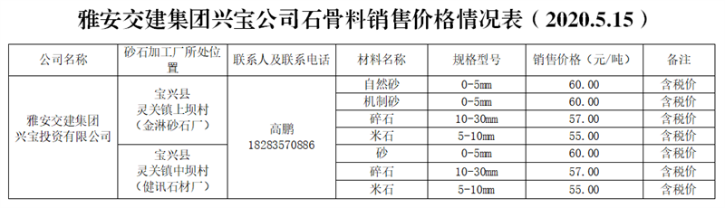 興寶投資有限公司。興寶公司是寶興縣人民政府指定寶興縣發(fā)展投資有限責任公司與雅安市交通建設(集團)有限責任公司共同組建的合資公司。目前,公司與兩家企業(yè)確定了代加工合作關系:一是寶興縣健迅石材廠;二是寶興縣金淋砂石有限公司;預計年生產(chǎn)能力約200萬噸。生產(chǎn)廠區(qū)距雨城區(qū)中心城區(qū)約55公里。