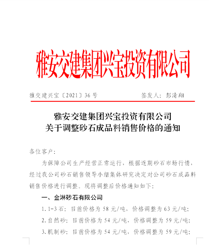 雅安交建集團(tuán)興寶公司砂石骨料銷售價(jià)格情況表(2021.5.22)