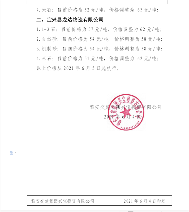 雅安交建集團(tuán)興寶公司砂石骨料銷售價(jià)格情況表(2021.6.5)