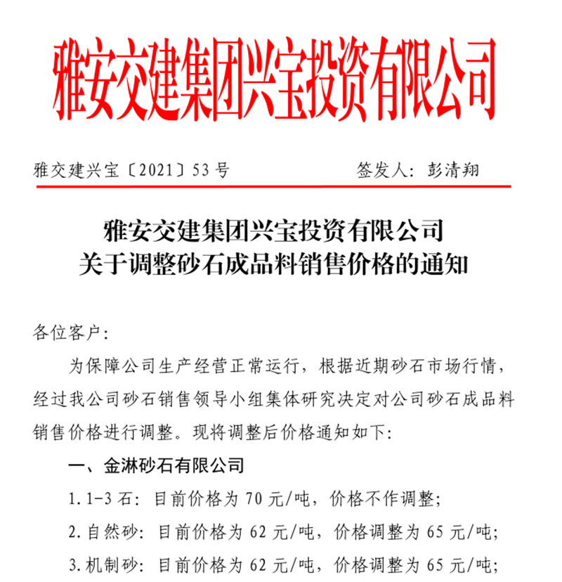雅安交建集團(tuán)興寶公司砂石骨料銷售價(jià)格情況表(2021.7.22)