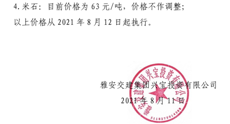 雅安交建集團(tuán)興寶公司砂石骨料銷售價(jià)格情況表(2021.8.12)