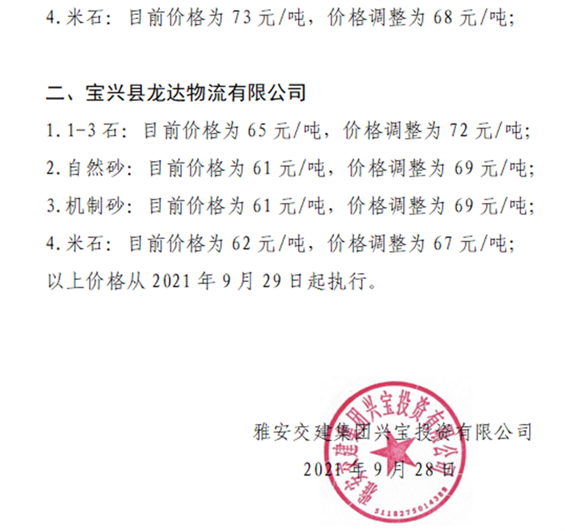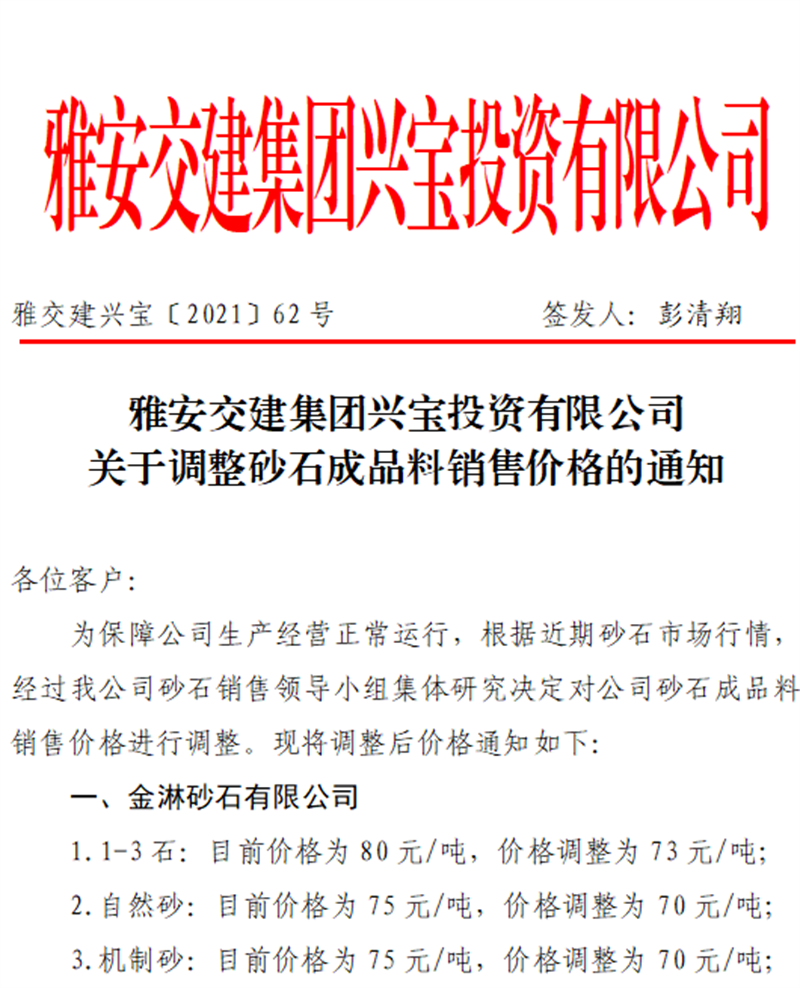 雅安交建集團興寶公司關(guān)于調(diào)整砂石成品料銷售價格的通知(2021.9.28)