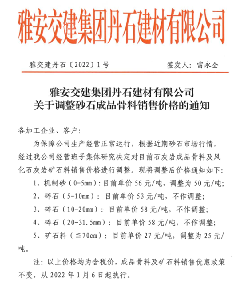 雅安交建集團丹石公司關(guān)于調(diào)整砂石成品骨料銷售價格的通知(2022.1.5)