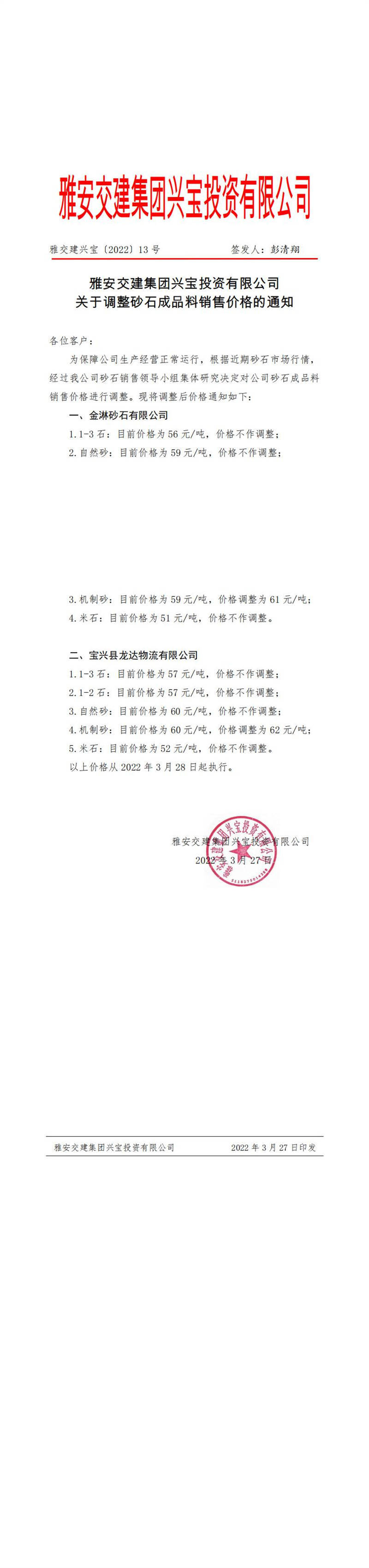 ÑŽ»½¨ÅdŒš¡²2022¡³13Ì–(h¨¤o) êP(gu¨¡n)ÓÚÕ{(di¨¤o)Õûɰʯ³ÉÆ·ÁÏäNÊÛƒr(ji¨¤)¸ñµÄ֪ͨ-3ÔÂ27ÈÕ