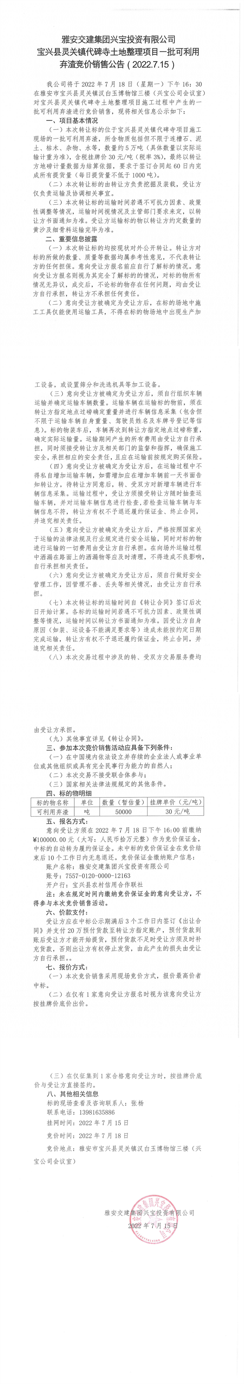 寶興縣靈關(guān)鎮(zhèn)代碑寺土地整理項目一批可利用棄渣競價銷售公告7.15(200萬噸)