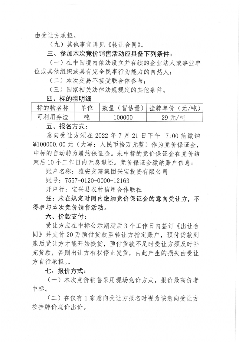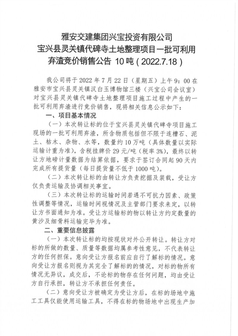 寶興縣靈關(guān)鎮(zhèn)代碑寺土地整理項目一批可利用棄渣競價銷售公告7.18(5萬噸)