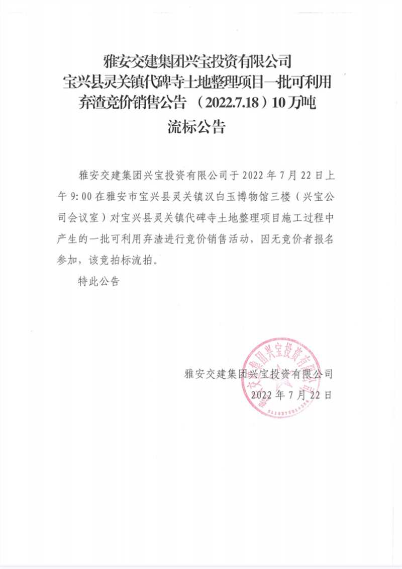 興寶公司寶興縣靈關(guān)鎮(zhèn)代碑寺土地整理項(xiàng)目10萬噸可利用棄渣競價銷售掛網(wǎng)公告7.22(10萬噸)