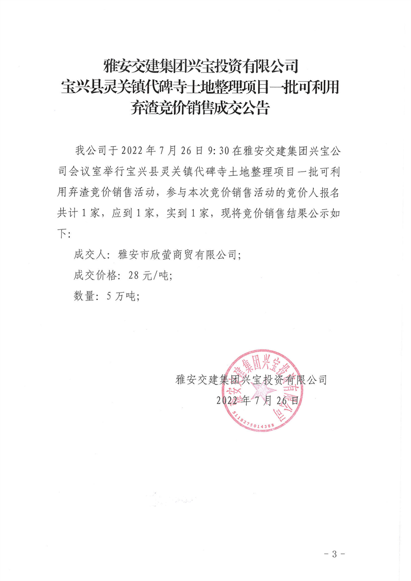 寶興縣靈關(guān)鎮(zhèn)代碑寺土地整理項(xiàng)目一批可利用棄渣競(jìng)價(jià)銷(xiāo)售成交公告7.26(5萬(wàn)噸)
