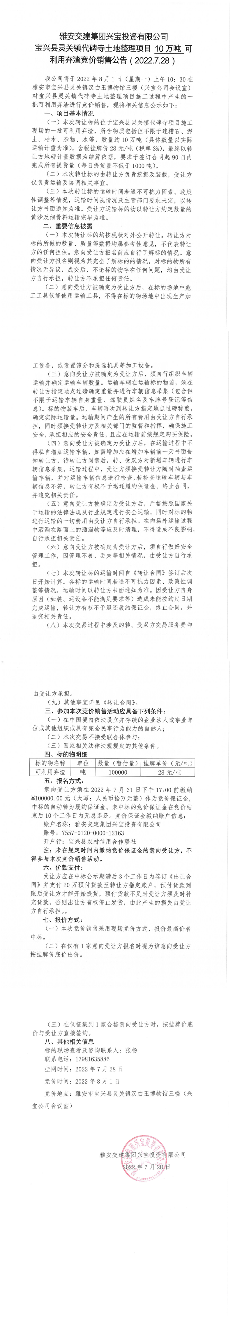 雅安交建集團(tuán)興寶投資有限公司靈關(guān)鎮(zhèn)代碑寺土地整理項(xiàng)目10萬(wàn)噸可利用棄渣競(jìng)價(jià)銷(xiāo)售公告(2022.7.28)