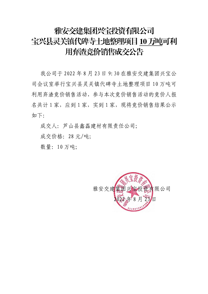 雅安交建集團(tuán)興寶投資有限公司寶興縣靈關(guān)鎮(zhèn)代碑寺土地整理項(xiàng)目10萬噸可利用棄渣競價(jià)銷售成交公告(8.23)