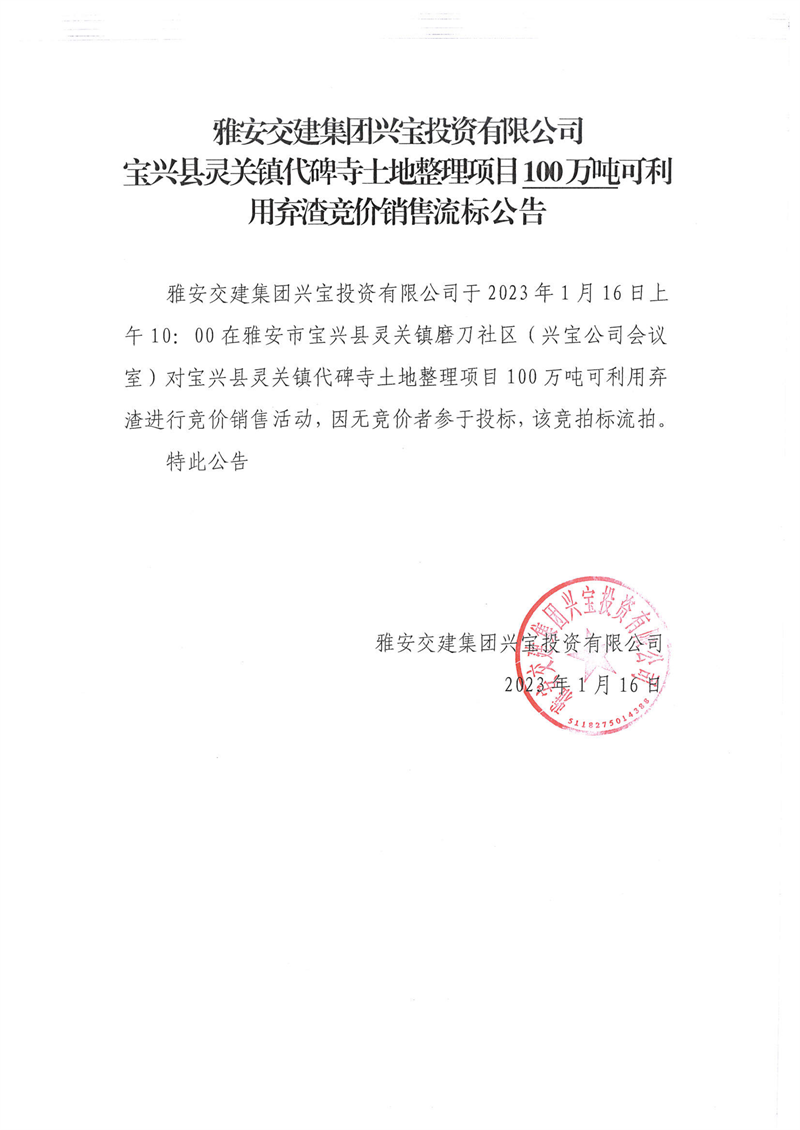 雅安交建集團(tuán)興寶投資有限公司100萬噸可利用棄渣競價銷售流標(biāo)公告(2023.1.16)