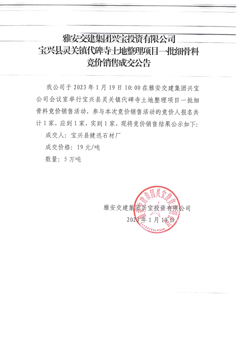 雅安交建集團興寶投資有限公司代碑寺土地整理項目細骨料競價銷售成交公告(2023.1.19)