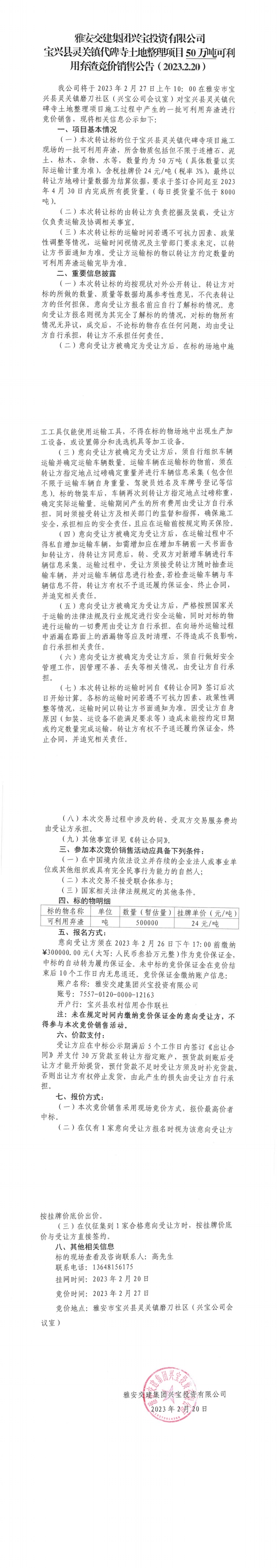 雅安交建集團(tuán)興寶投資有限公司靈關(guān)鎮(zhèn)代碑寺土地整理項(xiàng)目50萬(wàn)噸可利用棄渣競(jìng)價(jià)銷(xiāo)售公告(2023.2.20)、