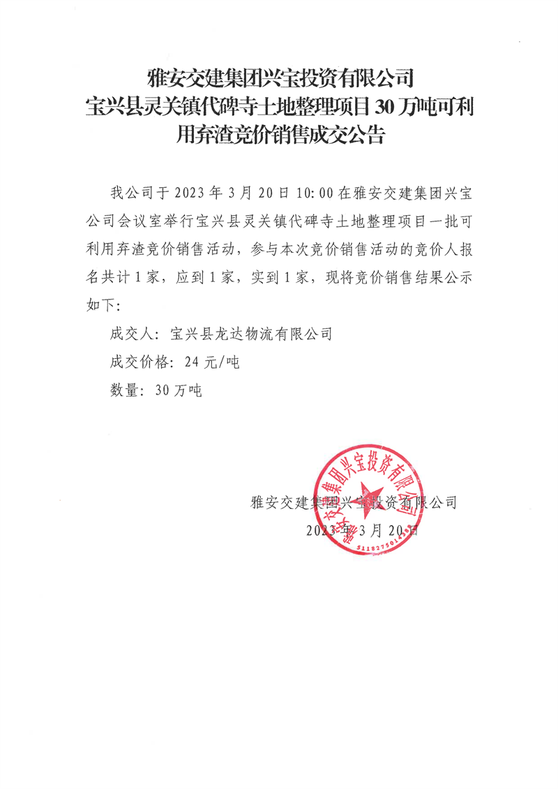 雅安交建集團(tuán)興寶投資有限公司30萬噸可利用棄渣競價(jià)銷售成交公告、5萬噸細(xì)骨料竟價(jià)成效公告(2023.3.14)