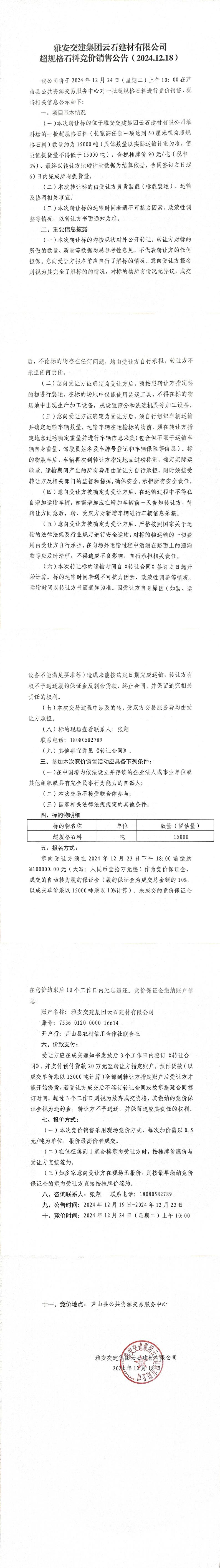 ÑŰ²½»½¨¼¯ˆF(tu¨¢n)ÔÆÊ¯½¨²ÄÓÐÏÞ¹«Ë¾³¬ÒŽ(gu¨©)¸ñʯƷÁϸ‚(j¨¬ng)ƒr(ji¨¤)äN(xi¨¡o)ÊÛ¹«¸æ£¨2024-12-19£©