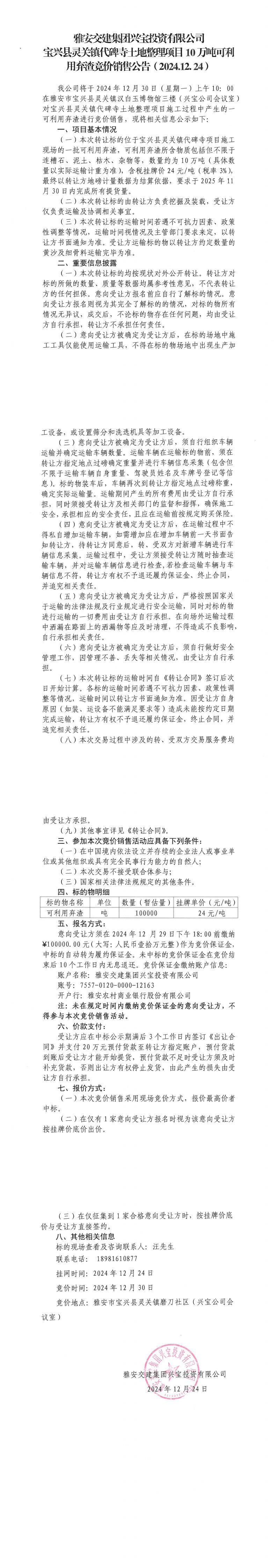雅安交建集團(tuán)興寶投資有限公司靈關(guān)鎮(zhèn)代碑寺土地整理項(xiàng)目10萬噸可利用棄渣競價銷售公告(2024.12.24)